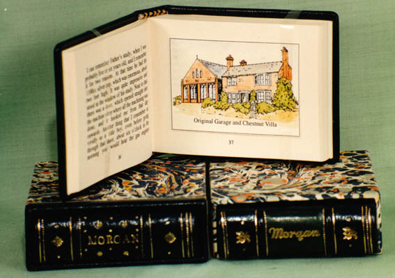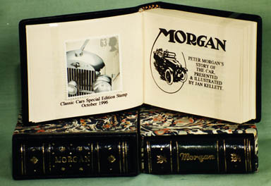 The frontispiece for each book is a Royal Mail postage stamp of a Morgan car from the Classic Car Series, October 1996. The foreword was written by Peter Morgan and the books are signed by him. I used to live just a few miles from the Morgan factory and would take the books in for him to sign as they were finished. He went in to work every day (health permitting) and was unfailingly courteous, always asking who the books were for, and he very often knew the purchaser. A few months before he died, I moved to Canada, and decided not to complete the edition without his signature. The edition is therefore terminated at 71 copies.***